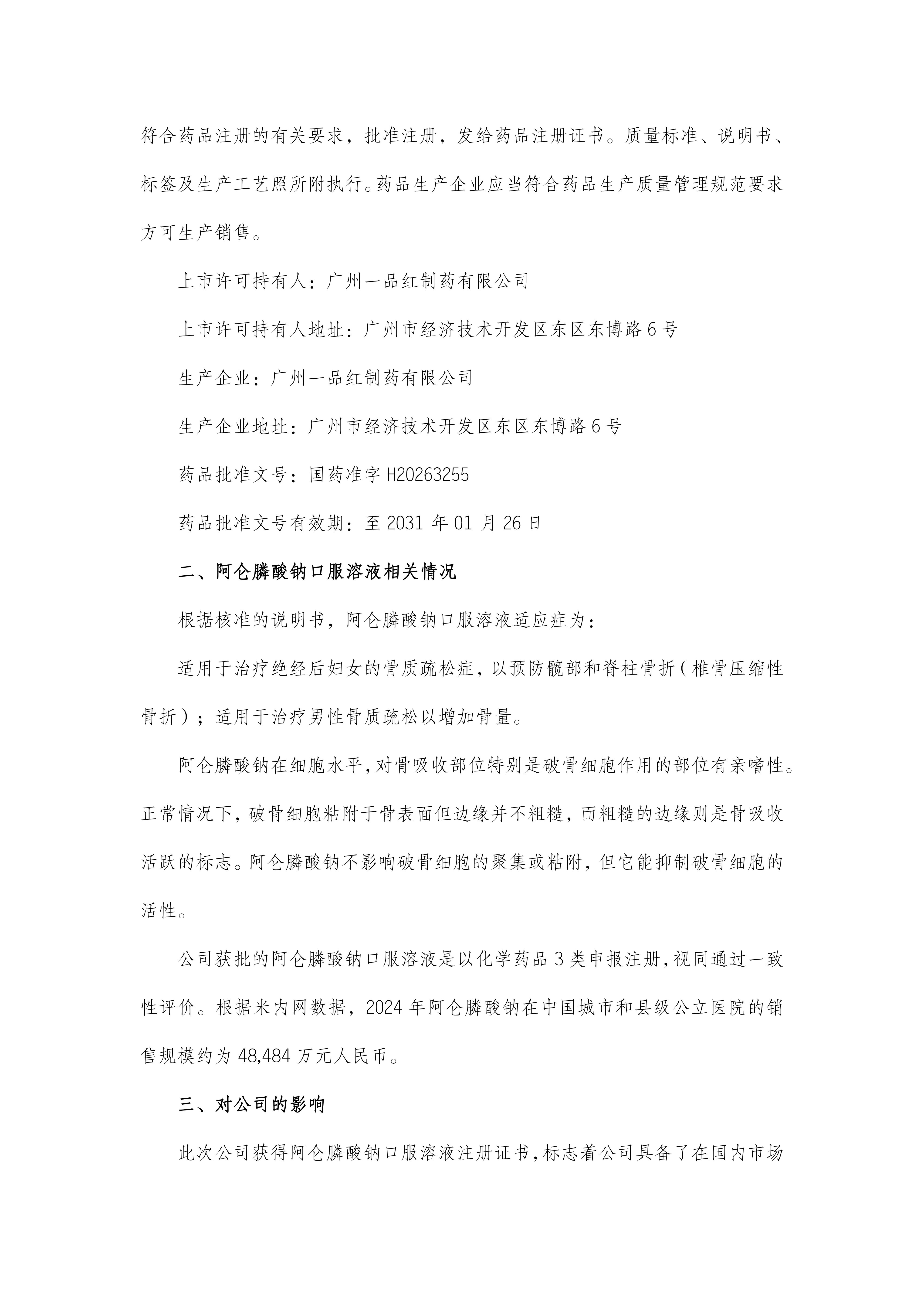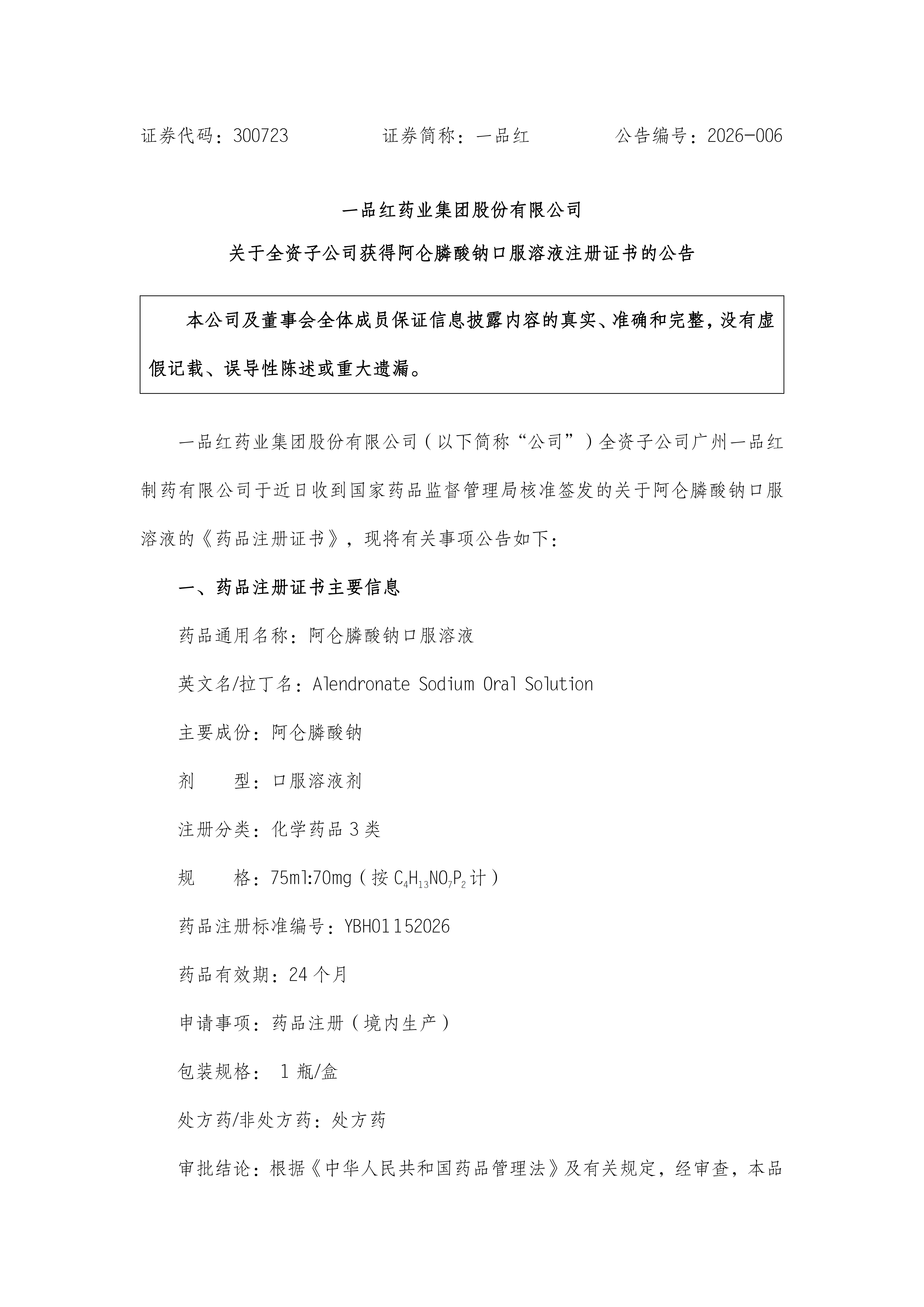 根据《z6com·尊龙(中国)时凯集团400药业集团股份有限公司关于全资子公司获得阿仑膦酸钠口服溶液注册证书的公告》(公告编号:2026-006),现予以公告。